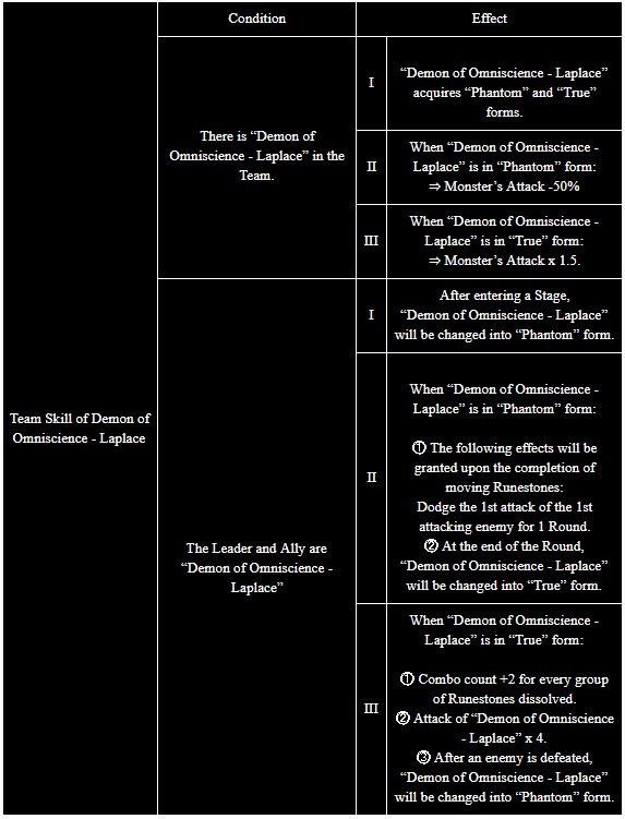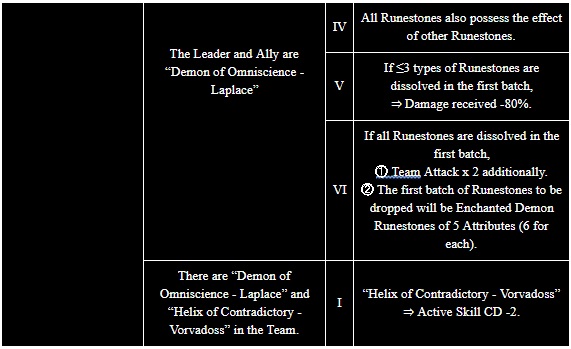 When using “Demon of Omniscience – Laplace” as Leader & Ally, all Runestones also possess the effect of other Runestones. If ≤3 types of Runestones are dissolved in the first batch, Damage received -80%. If all Runestones are dissolved in the first batch, Team Attack x 2 additionally.
