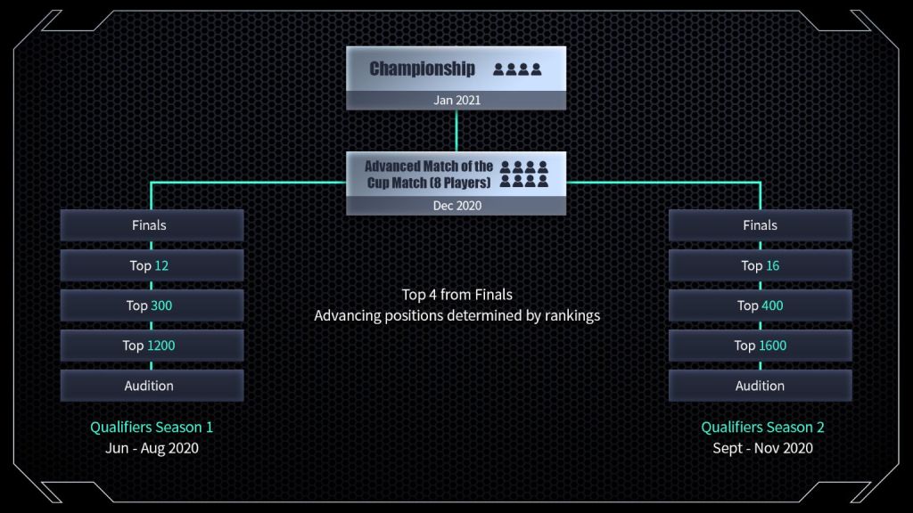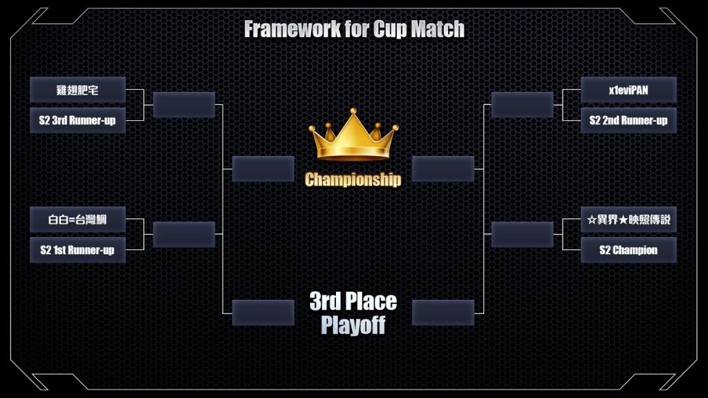 The top 4 contestants from both Qualifiers Season (S1 and S2) will enter the Advanced Match of the Cup Match. Single-elimination bracket arrangement will be used in the Championship for 1 on 1 battle. The framework is listed as below: