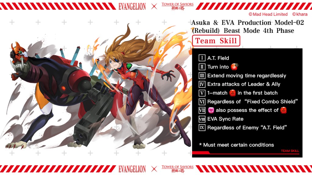 The team skill of “Asuka & EVA Production Model-02 (Rebuild) Combat Mode” can withstand 35,000 damage of “A.T. Field”. When using “Asuka & EVA Production Model-02 (Rebuild) Combat Mode” as leader and any forms of “Asuka” as ally, not only can you get the team skill effects like turning into Enchanted Fire Runestones, guaranteed moving time extension, extra attacks of leader and ally, you can acquire 2 more effects, including 2-match Fire Runestones in the first batch and Asuka’s damage dealt regardless of Fixed Combo Shield.