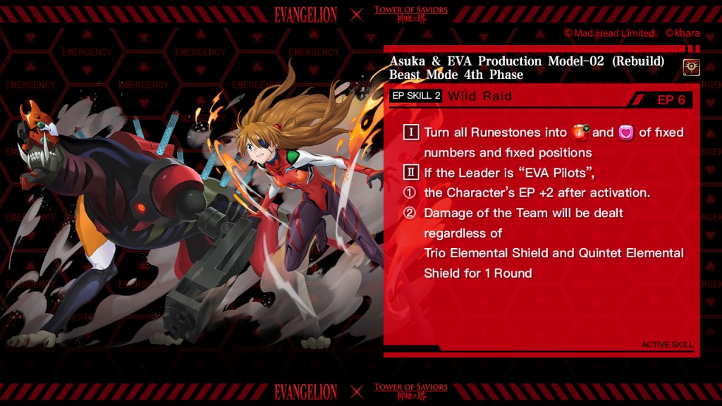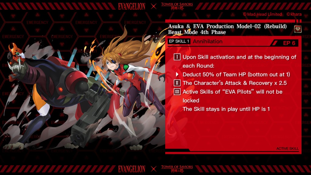 “Asuka & EVA Production Model-02 (Rebuild) Beast Mode 4th Phase” excels at attacking with dual EP skills. “Annihilation” increases the character’s attack and recovery at the expense of self HP, and active skills of “EVA Pilots” will not be locked.
