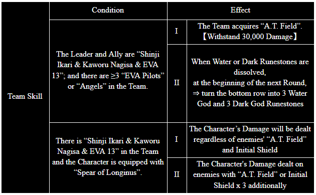 “Shinji Ikari & Kaworu Nagisa & EVA 13” has the team skill to withstand 30,000 damage of “A.T. Field”. Water God and Dark God Runestones will be turned to get attack multiplier. Also, the Character’s Damage will be dealt regardless of enemies’ “A.T. Field” and Initial Shield; the Character’s Damage dealt on enemies with “A.T. Field” or Initial Shield x 3 additionally.