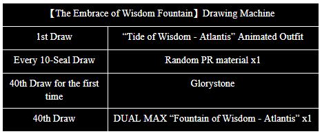 During the event “The Embrace of Wisdom Fountain”, when you login for the 1st time, 10 free draws of “The Embrace of Wisdom Fountain” will be given instantly. You can immediately go for a 10-Seal Draw option to try your luck to get “Fountain of Wisdom – Atlantis”!