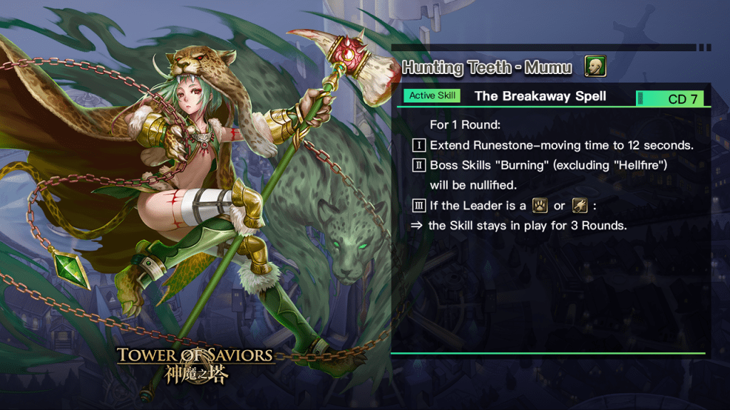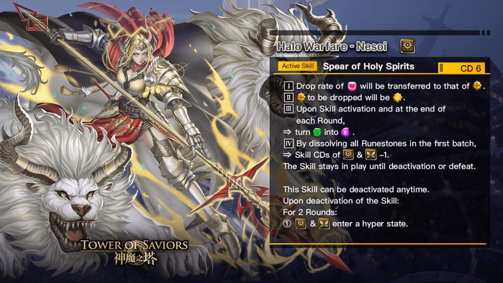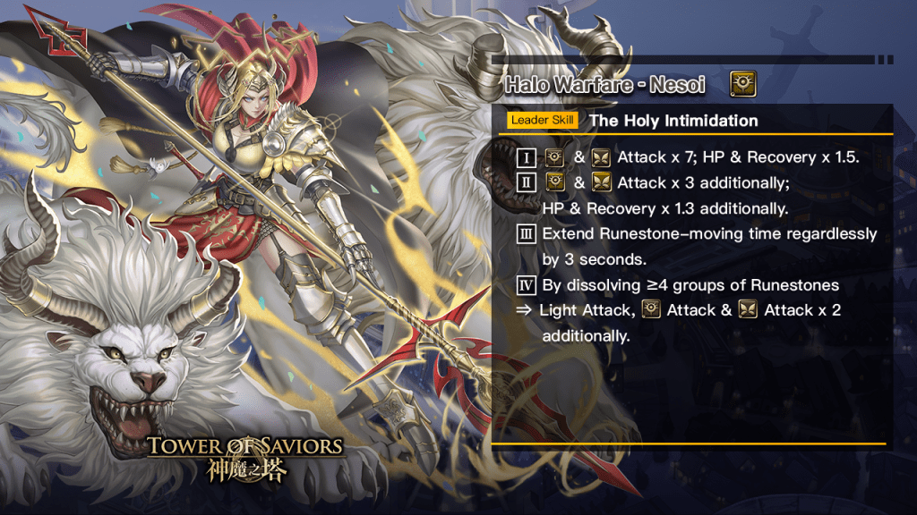 | Both the Leader and Ally are “Halo Warfare – Nesoi”. | I.Damage received from Boss Skill “Burning” will be converted to HP Recovery. II.Skill CD of “Halo Warfare – Nesoi” -6 after entering a Stage. III. Damage received from an enemy with Boss Skill “Runestone Number Shield (First Batch)” -50%. IV. Water, Fire, Light and Dark Runestones also possess the effect of each other. V. Light and Dark Runestones also possess 50% effect of Heart Runestones. VI. With a number of additional effect(s) in play: ▋≥1:Team Attack x 1.5. ▋≥2:Combo count +5. ▋≥3:God & Elf Damage will be dealt regardless of Fixed Combo Shield. ▋≥4:God & Elf Damage will be dealt regardless of Trio Elemental Shield and Quintet Elemental Shield. ▋≥5:Ex. Combo count +8. |