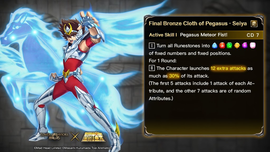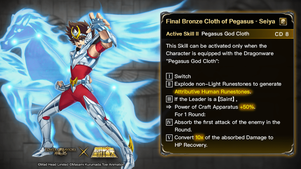 | Final Bronze Cloth of Pegasus – Seiya | Own DUAL MAX Athena the Goddess of War and Wisdom. | When the Character’s Character Runestone is triggered and no Character Runestone is dissolved in the first batch, ⇒ the Character’s Skill CD -1. |