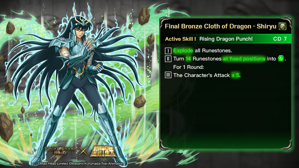 | There is “Final Bronze Cloth of Dragon – Shiryu” without the Dragonware “Dragon God Cloth” in the Team. | Change the Active Skill of “Final Bronze Cloth of Dragon – Shiryu” without the Dragonware “Dragon God Cloth” into “High Dragon Punch!”: I. Release the locked Skill of the Character. (This Skill will not be locked) II. Restore all Runestones to normal state. III. Restore all cracked positions. IV. The Character becomes disabled and no skill and attack can be launched after 1 Round.For 1 Round: V. The Character’s Attack x 9. VI. 1% of total Team HP will be depleted for every step moved (bottom out at 1). |