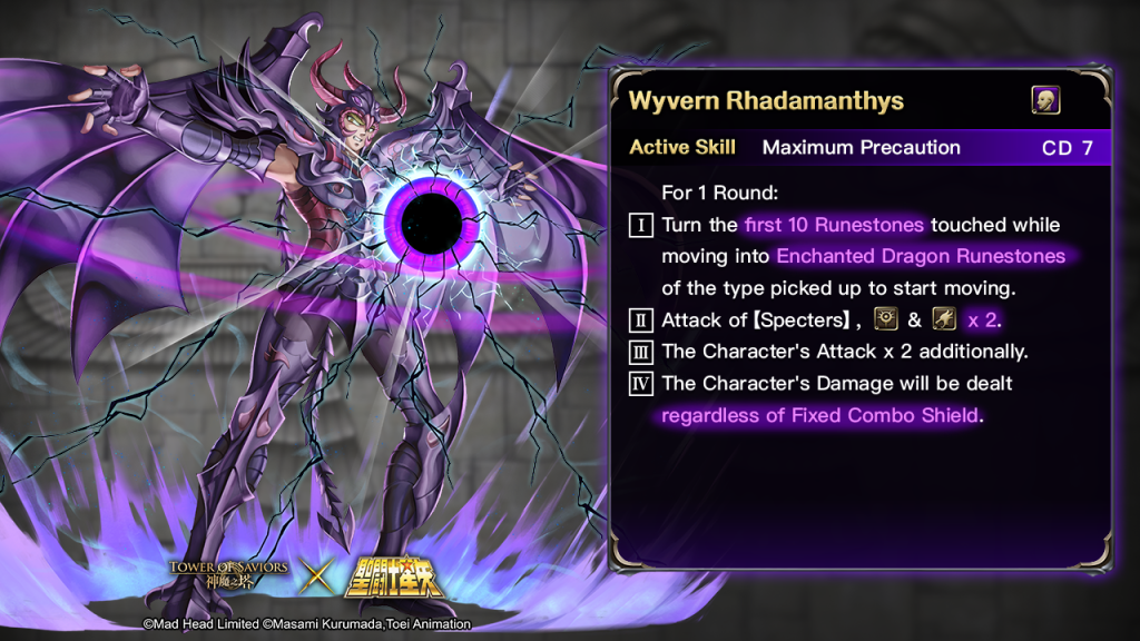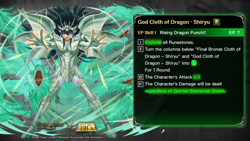 | There are the following Characters in the Team: “God Cloth of Pegasus – Seiya ”“God Cloth of Andromeda – Shun” “God Cloth of Phoenix – Ikki” “God Cloth of Dragon – Shiryu” “God Cloth of Cygnus – Hyoga” (The Characters must reach Lv. 50 or above.) *≥To activate the EP Combined Skill, ≥10 EPs are required for each member mentioned above. Upon Skill activation, EPs of the above 5 Members -10. | I.Remove all Runestones to generate columns of Enchanted Human Runestones of all types. II. Deal 500 million non-Attributive Damage to all enemies.For 1 Round: III. All Runestones also possess 200% effect of other Runestones. IV. Each Member launches 5 extra attacks. V. Team Damage will be dealt regardless of Defense, Fixed Combo Shield and Puzzle Shield. |