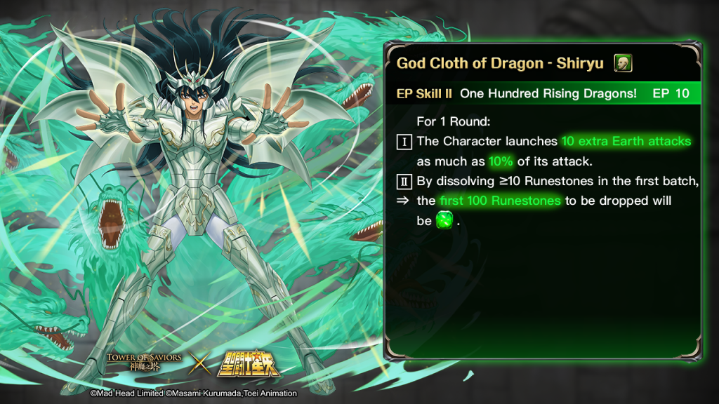 | God Cloth of Dragon – Shiryu | Own DUAL MAX Athena the Goddess of War and Wisdom. | By dissolving the Character’s Character Runestones in the first batch, ⇒ the Character’s Damage dealt to God enemies +50%. |