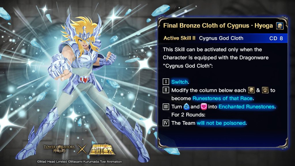 | The Leader and Ally are “Final Bronze Cloth of Dragon – Shiryu”, “God Cloth of Dragon – Shiryu”, “Final Bronze Cloth of Cygnus – Hyoga” or “God Cloth of Cygnus – Hyoga”. | I. By dissolving all Earth or Water Runestones in the first batch, ⇒ Team Attack x 5. II. By dissolving all Heart Runestones in the first batch, ⇒ each Member launches an extra attack as much as 50% of its attack. |