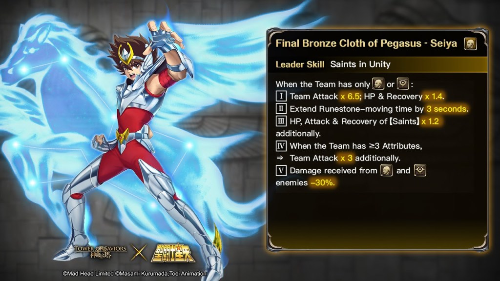 | The Leader is either “Seiya”, “Hyoga”, “Shiryu”, “Ikki” or “Shun”, with the others as Team Members (whichever form). | I. HP, Attack & Recovery basic value of the first “Seiya”, “Hyoga”, “Shiryu”, “Ikki” and “Shun” from the left (whichever form) x 1.2 additionally.II. Extend Runestone-moving time to 12 seconds. |