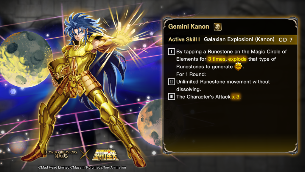 | The Leader is anyone of the following Characters: – “Final Bronze Cloth of Pegasus – Seiya” – “God Cloth of Pegasus – Seiya” – “Final Bronze Cloth of Andromeda – Shun” – “God Cloth of Andromeda – Shun” – “Final Bronze Cloth of Phoenix – Ikki” – “God Cloth of Phoenix – Ikki” – “Final Bronze Cloth of Dragon – Shiryu” – “God Cloth of Dragon – Shiryu” – “Final Bronze Cloth of Cygnus – Hyoga” – “God Cloth of Cygnus – Hyoga” | Acquire the “Eighth Sense”: For 3 Rounds: I. Boss Skills “Sticky” and “Burning” will be nullified. II. Runestone movement will not be stopped when an Electrified Runestone is touched. III. 【Saints】: ⓵ Attack x 1.5. ⓶ Damage will be dealt regardless of Fixed Combo Shield. IV. The Craft Apparatus cannot be charged up in the usual way. The Eighth Sense can be activated at the beginning of the Round by tapping the fully charged Craft Apparatus at the expense of 100% of the power gathered. |