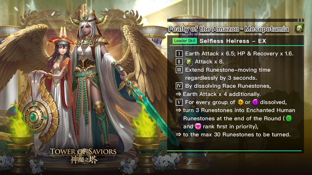 | Both the Leader and Ally are “Fealty of the Amazon – Mesopotamia”. | I. Light and Dark Runestones can be dissolved by grouping 2 or more of them (Drop rate of all Runestones will not be affected by Amelioration or Skills, including those altering the Attribute of dropping Runestones). II. Light and Dark Runestones also possess the effect of Earth and Heart Runestones. III. Skill CDs of the Leader and Ally -5 after entering a stage and at the end of the first Round. |