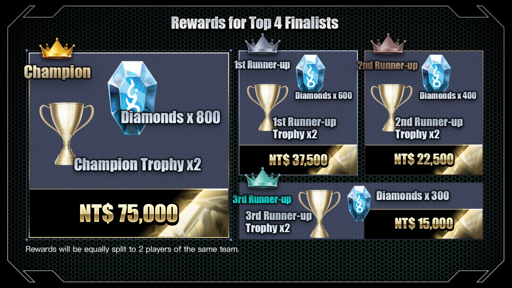 Caution: The above ranking rewards will be shared equally by the two players of the same team. Contestants who fail to finish the Top 4 match for any reason will not be eligible to claim the participation rewards.