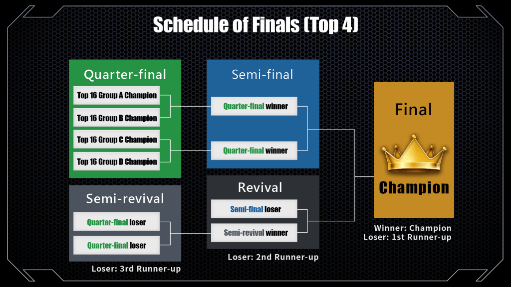 - The ruling of each challenge will be the same as the Top 16 Group Match except that there will be no corresponding scores. Results will be determined solely based on the number of challenges won. The teams will advance to the next round until the champion, second and third places are confirmed (for details, see Appendix II).