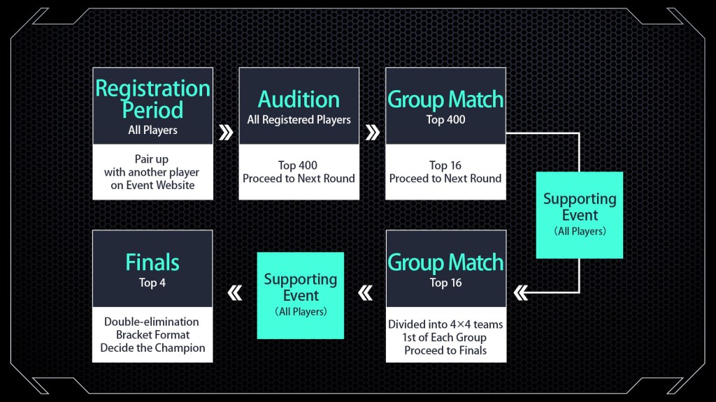 - Players need to enter his/her partner’s UID on the Event Website (will be announced soon) to pair up. The team score of the Audition Stage will be recorded only after Players have completed the Registration and Pairing process on the Event Website.