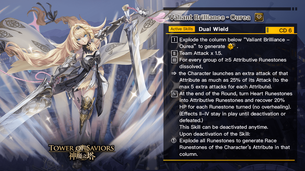 | The Leader is “Valiant Brilliance – Ourea”. | I. Extend Runestone-moving time regardlessly by 5 seconds. II. Heart Runestones also possess the effect of Light Runestones. III. All Attributive Runestones also possess the effect of other Attributive Runestones. IV. Runestones of Members’ Attributes also possess 25% effect of Heart Runestones. V. By dissolving ≥5 Runestones in a column, ⇒ Runestones of 5 Attributes will be generated in that column in the first batch. VI. By moving with a Character Runestone, Boss Skills “Burning” and “Sticky” will be nullified. VII. By dissolving all Runestones in the column below the Leader or Ally in the first batch, ⇒ Attack of “Valiant Brilliance – Ourea” x 4. VIII. By dissolving all Runestones in the columns below the Leader and Ally in the first batch, ⇒ Attack of “Valiant Brilliance – Ourea” x 1.5 additionally. |