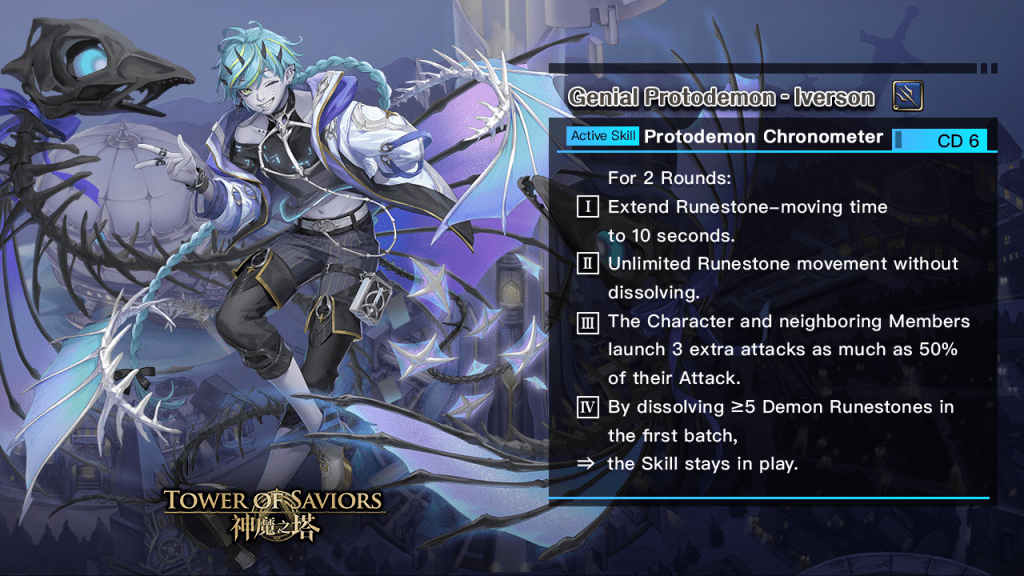 | The Leader is “Genial Protodemon – Iverson”. | I. Extend Runestone-moving time by 3 seconds. II. Turn the Water, Light and Heart Runestones touched while moving into Enchanted Demon Runestones. III. By dissolving Attributive Race Runestones, ⇒ each Member launches an extra attack of that Attribute as much as 50% of its Attack. IV. By dissolving Heart Race Runestones, ⇒ Damage received -50%. V. When there is an additional effect in play, ⇒ Team Attack x 2. VI. Clear the negative state of Frozen Runestones touched while moving with the Character Runestone of “Genial Protodemon – Iverson”. |