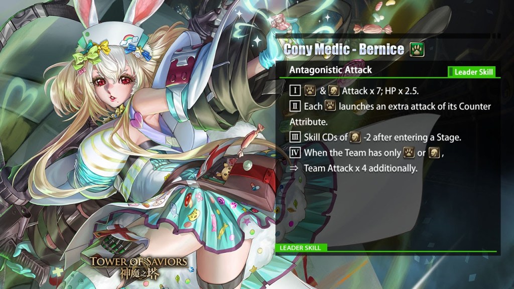 | The Leader is “Cony Medic – Bernice”. | I. Extend Runestone-moving time regardlessly by 3 seconds. II. The more the current HP, the higher the Team Attack, ⇒ to the max x 6 when HP is full. III. When current HP is full, ⇒ Damage will be dealt regardless of Initial Shield. IV. Heart Runestones also possess the effect of Attributive Runestones. V. If HP is not full at the end of the Round, ⇒ Skill CDs of all Members -1. VI. By dissolving a group of ≥5 Runestones in the shape of【十】in the first batch, ⓵ Damage will be dealt regardless of Duet Elemental Shield, Trio Elemental Shield, Quartet Elemental Shield and Quintet Elemental Shield. ⓶ Each Member launches 2 extra attacks. |
