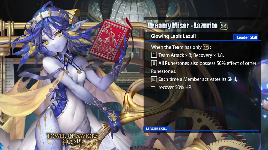 | The Leader is “Dreamy Miser – Lazurite”. | I. Extend Runestone-moving time by 3 seconds. II. Add 3x the Recovery basic value of each Elf into its own Attack basic value. III. If HP is not full at the end of the Round, ⇒ Skill CD of “Dreamy Miser – Lazurite” -1. IV. By dissolving ≥3 types of Runestones, ⇒ Elf Damage will be dealt regardless of Initial Shield. |