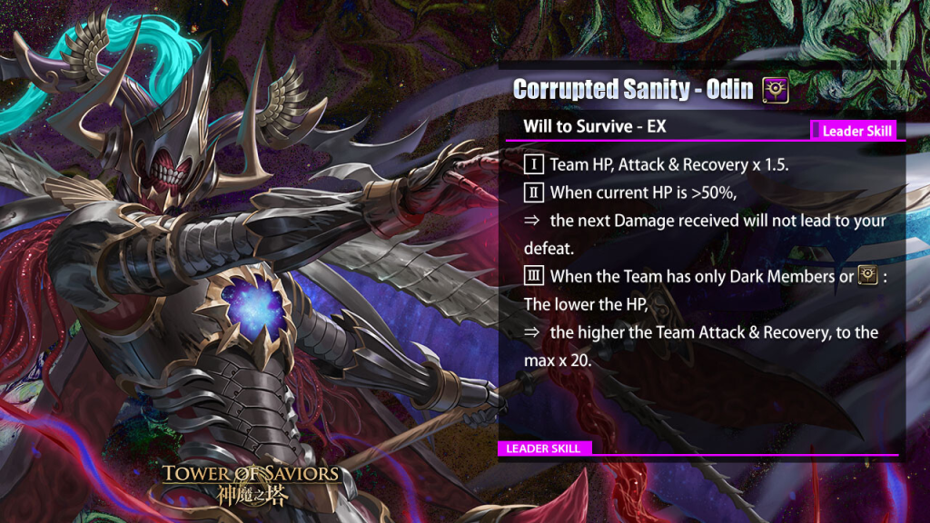 | There is “Corrupted Sanity – Odin” in the Team. | When there are Runestones in black and white,⇒ turn the Runestones touched while moving into Enchanted God Runestones. |