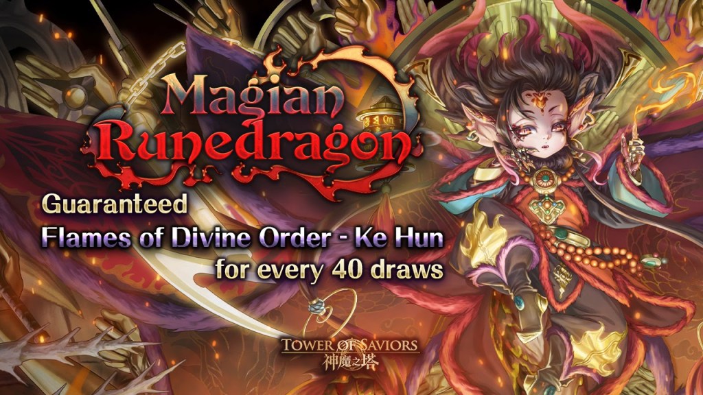 | ★ 6th Event: Diamond Seal Event “Magian Runedragon” Time: 15 Nov (Mon) 13:00 to 24 Nov (Wed) 23:59 During the event period, a new exclusive Black-gold Seal of “Magian Runedragon” will be available! Summoners shall see the immense power and great glory of the Runedragons!! Event setting: 1. “Flames of Divine Order – Ke Hun” (Lv. 1; Skill Lv. 1) x1 will be guaranteed for every 40 draws in the “Magian Runedragon” Seal during the event period. 2. Summoners will be given “Golden Mothdrake” x3 upon every 10-draws in the “Magian Runedragon” Seal. 3. Summoners will be rewarded with the Fire-exclusive dragonware “Carmine Lantern” (selectable) x 1 upon getting the exclusive character “Flames of Divine Order – Ke Hun” for the first time during the event period. (The Dragonware will no longer be given after the event period.) 4. Meanwhile, the Fire-exclusive dragonware “Carmine Lantern” can also be forged. 5. “Ancient Coin Seal” and “Ancient Coin Trading” will be available as well. Summoners can use a certain amount of Ancient Coins to redeem “Chinese Gods”, “Servant of Dragons”, “Egyptian Gods” and “The Witches” that they have obtained before. |