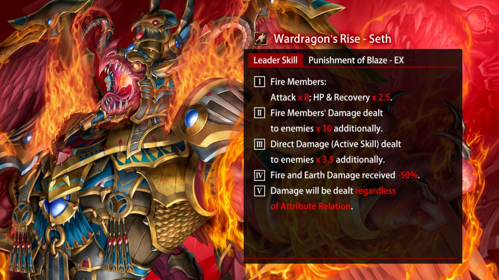 | Both the Leader and Ally are “Wardragon’s Rise – Seth”. | ◆ Dragon and God Runestones also possess the effect of each other. ◆ Effect of Fire Runestones increases by 200%. ◆ Upon the activation of a Fire Member’s Skill: ⇒ Damage of Fire Members will be dealt regardless of ⓵ Enchanted Runestone Shield ⓶ Initial Shield ⓷ Duet Elemental Shield, Trio Elemental Shield, Quartet Elemental Shield, Quintet Elemental Shield. ◆ Upon the first Skill activation of “Wardragon’s Rise – Seth” each Round, ⇒ Skill CD of that “Wardragon’s Rise – Seth” -6. |