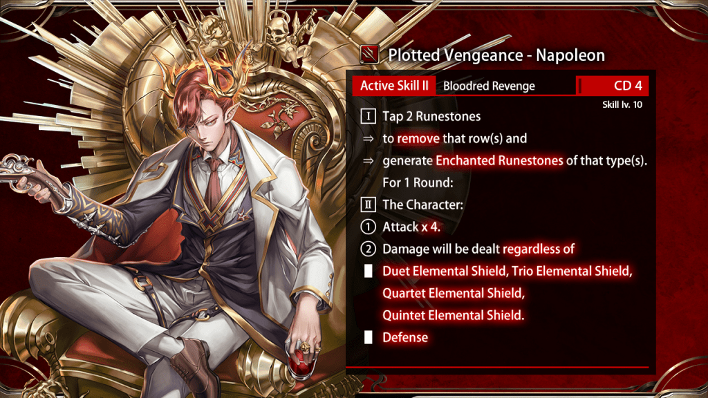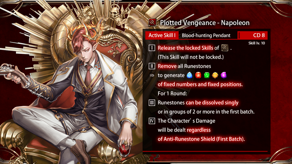 | The Leader is “Plotted Vengeance – Napoleon” and the Ally is a 【Blood Extortioner】 Member. | ◆ Beasts and Demons: ⇒ Skill CDs -4 after entering a Stage. ◆ Fire Members: ⇒ Skill CDs -4 after entering a Stage. ◆【Blood Extortioner】 Members: ⇒ Skill CDs -1. ◆ By dissolving a Water or Earth Character Runestone in the first batch: ⇒ At the end of the Round, turn all Runestones into Water, Fire and Earth Runestones of fixed numbers and fixed positions. ◆ By dissolving a Fire Character Runestone in the first batch: ⇒ At the end of the Round, turn all Runestones into Runestones of 5 Attributes of fixed numbers and fixed positions. ◆ By dissolving a Light or Dark Character Runestone in the first batch: ⇒ At the end of the Round, turn all Runestones into Light and Dark Runestones of fixed numbers and fixed positions. |