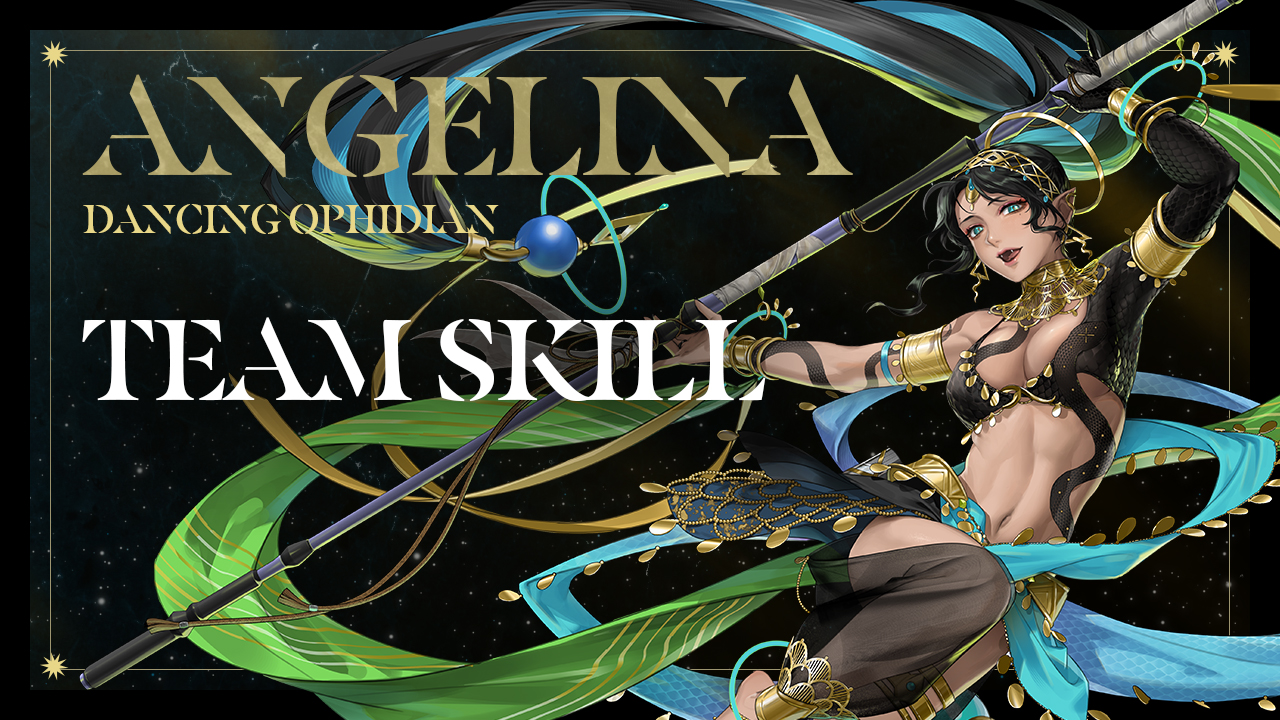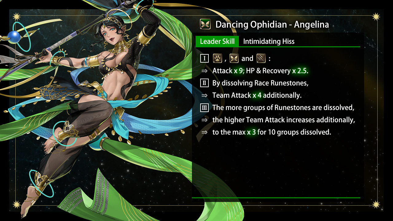| The Leader is “Dancing Ophidian – Angelina”. | ◆ Extend Runestone-moving time regardlessly by 3 seconds. ◆ Damage will be dealt regardless of Puzzle Shield. ◆ Damage received from Step Damage will be lowered to 0. ◆ Beasts, Elves and Demons: ⇒ Attack x 4. ◆ At the beginning and at the end of each Round: ⇒ Modify the top and bottom Runestones in the columns below Beasts, Elves and Demons to become Runestones of the corresponding Members’ Races. ◆ Beast, Elf and Demon Runestones can be dissolved singly or in groups of 2 or more with the adjacent Runestones of the same type(s) in the first batch. ◆ All Runestones also possess the effect of Heart Runestones and Runestones of the specified Races’ Attributes (Beasts, Elves and Demons) in the Team. ◆ Upon an Active Skill activation of a Beast, Elf or Demon: ⓵ Invisible enemies will be revealed. ⓶ Beasts, Elves and Demons: ⇒ Attack x 2. ⇒ Damage will be dealt regardless of ▋ Anti-Runestone Shield (First Batch) ▋ Runestone Combo Nullifying ◆ By dissolving ≥12 groups of Runestones in the first batch, ⇒ Beasts, Elves and Demons: Skill CDs -1. |