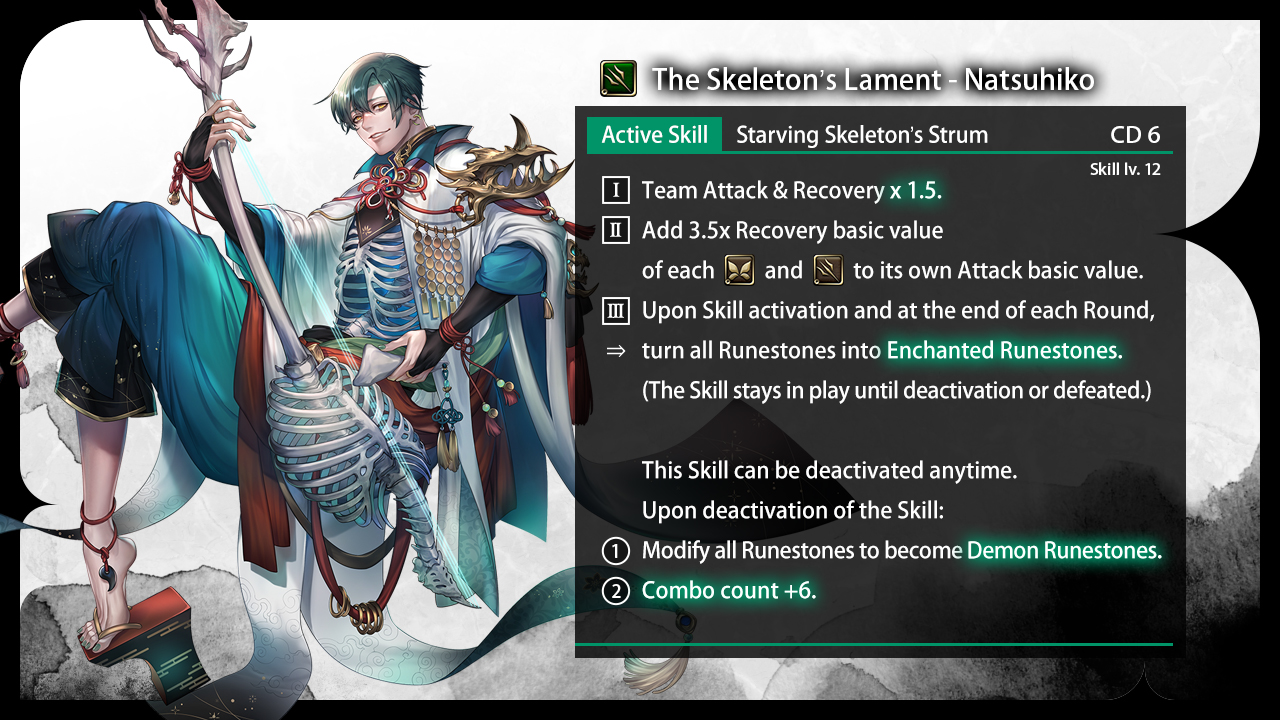 | The Leader is “The Skeleton’s Lament – Natsuhiko”. | ◆ Extend Runestone-moving time by 3 seconds. ◆ Elves and Demons: ⓵ Skill CDs -6 after entering a Stage. ⓶ Damage will be dealt regardless of Initial Shield. ◆ At the beginning: ⇒ Turn the columns below Elves and Demons into Runestones of the corresponding Members’ Attributes. ◆ By dissolving a Character Runestone, ⇒ at the end of the Round: Turn the columns below Elves and Demons into Runestones of the corresponding Members’ Attributes. ◆ When the current HP is full, ⇒ the Damage received in the Round will not lead to your defeat. |
