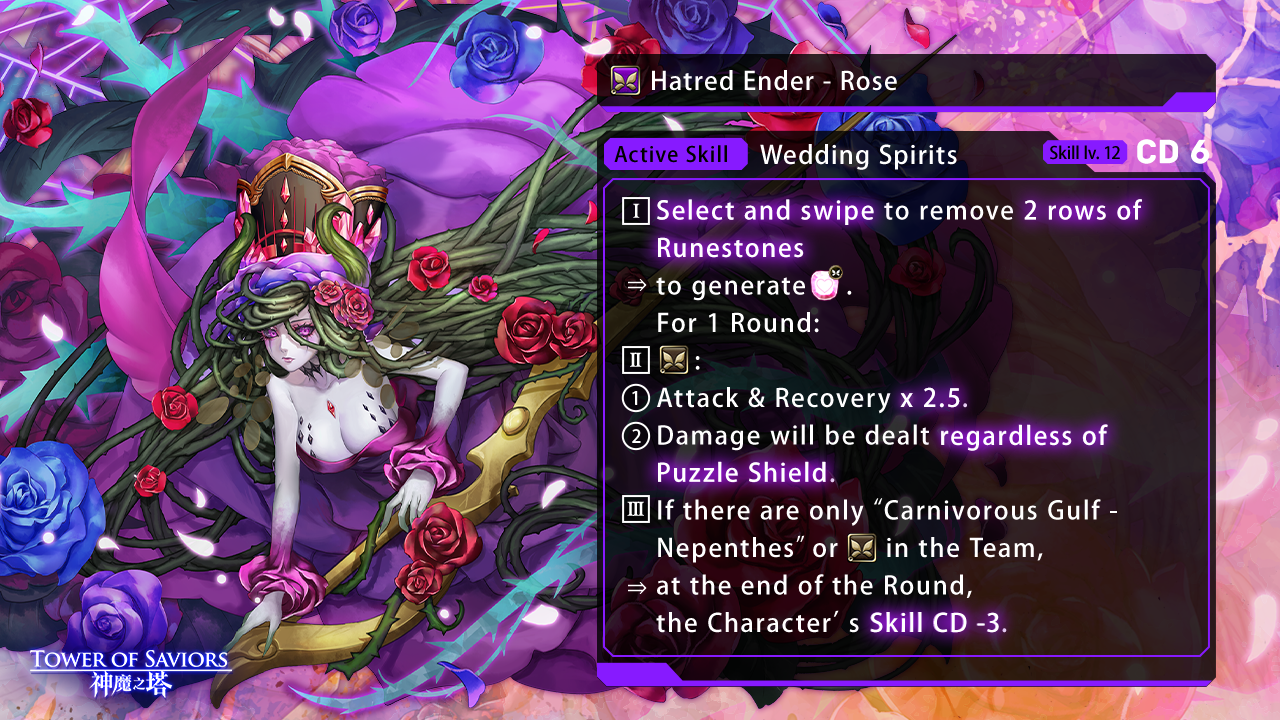 | There are “Hatred Ender – Rose” and “Carnivorous Gulf – Nepenthes” in the Team. | ◆ “Hatred Ender – Rose” and “Carnivorous Gulf – Nepenthes”: ⇒ HP, Attack & Recovery basic value x 1.5. ◆ Change the Active Skill of “Carnivorous Gulf – Nepenthes” to “Engulfed in Carnivorous Petals”. I. Turn all Runestones into Enchanted Runestones. For 1 Round: II. Team Attack x 2.5; By dissolving ≥2 groups of Fire, Dark or Heart Runestones in total: ⓵ Team Attack x 3.5. ⓶ “Hatred Ender – Rose” and “Carnivorous Gulf – Nepenthes”: ⇒ Damage will be dealt regardless of enemies’ specific Damage-reducing Resistance. |