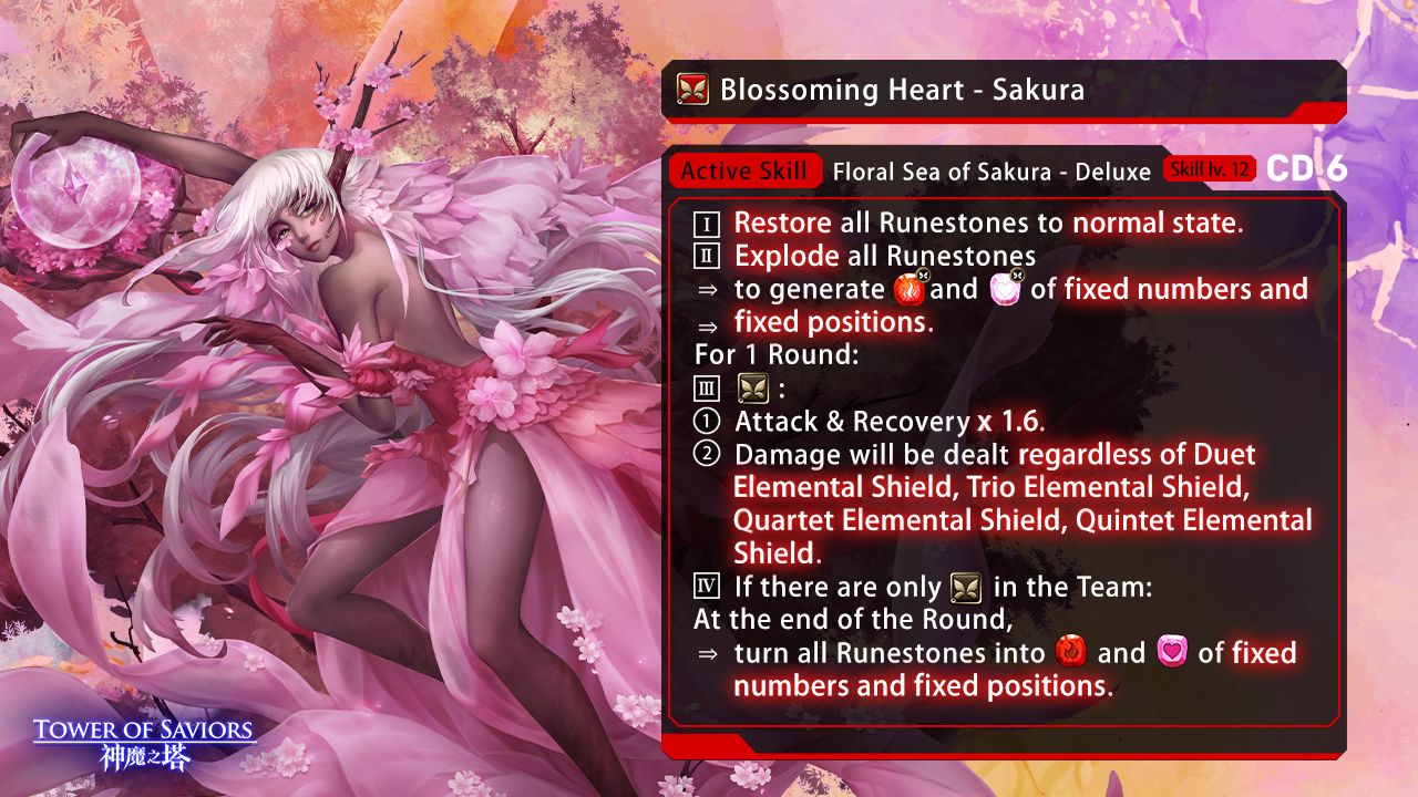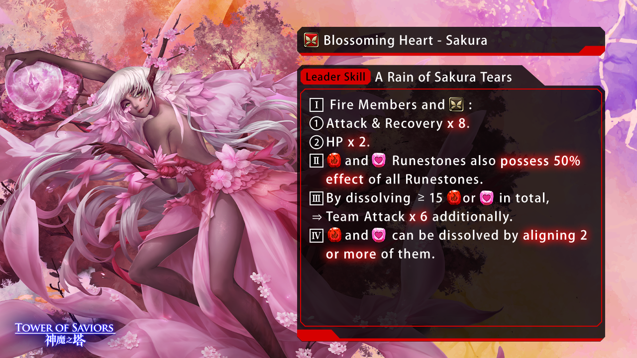 | The Leader is “Blossoming Heart – Sakura” and the Ally is an Elf. | ◆ Extend Runestone-moving time regardlessly by 3 seconds. ◆ “Burning” will be nullified. ◆ Damage received from Scorching Areas -99%. ◆ For each group of Water, Fire or Earth Runestones dissolved in the first batch, ⇒ 5 Enchanted Fire Elf Runestones will be generated. ◆ For each group of Light, Dark or Heart Runestones dissolved in the first batch, ⇒ 5 Enchanted Heart Elf Runestones will be generated. ◆ For every 8 Fire or Heart Runestones dissolved cumulatively, ⇒ 1 Enchanted Fire Elf Runestone will be generated. ◆ When ≥8 Combos are made, ⇒ Damage will be dealt regardless of Initial Shield. ◆ When ≥16 Combos are made,⇒ the Leader and Ally each launches 5 extra attacks (one Attribute each) as much as 50% of its Attack. |