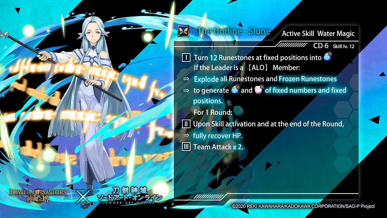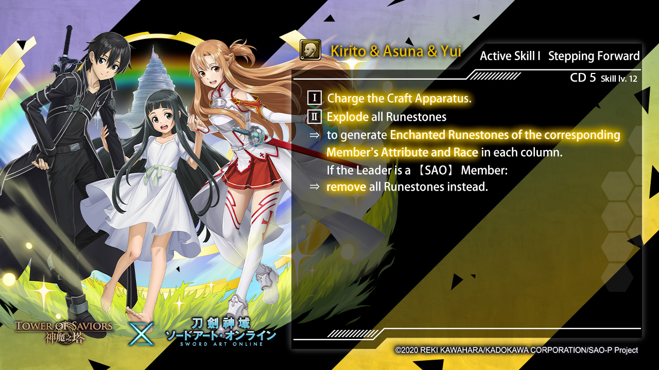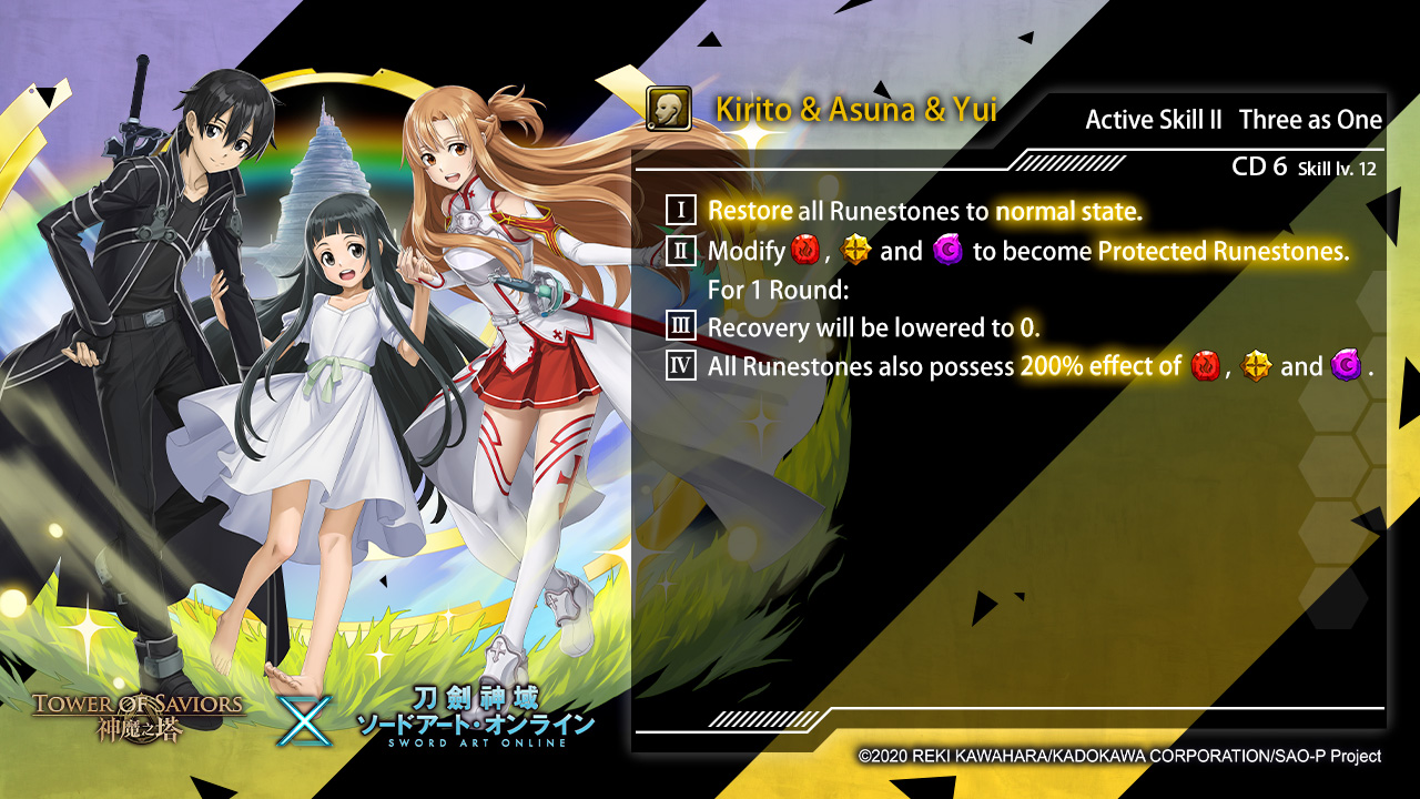 | The Leader is “Kirito & Asuna & Yui” and the Ally is a【SAO】 Member. | ◆ Extend Runestone-moving time regardlessly by 5 seconds. ◆ All Runestones also possess the effect of all Runestones. ◆ Combo count +10. ◆ At the end of each Round, ⇒ turn all Runestones into Runestones of the type used to start the first Runestone movement. ◆ By dissolving ≥30 Runestones, ⇒ Leader: ⓵ Attack x 5. ⓶ Damage will be dealt regardless of ▋Fixed Combo Shield ▋Equal-Combo Shield |