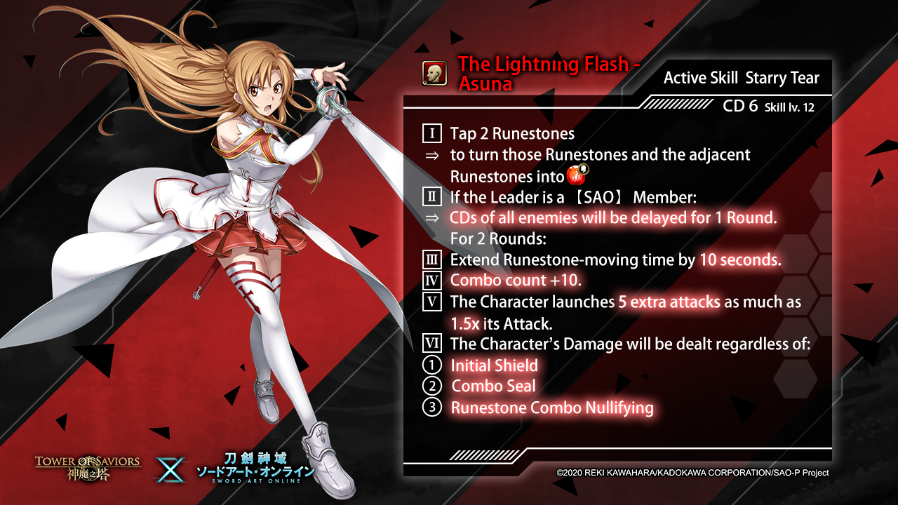 | The Lightning Flash – Asuna | Own The Black Swordsman – Kirito | By dissolving the Character’s Character Runestone in the first batch, ⇒ Combo count +2. |