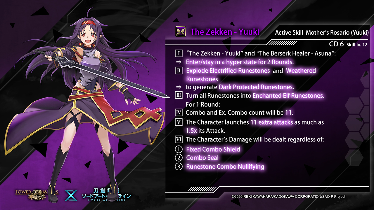| There are “The Berserk Healer – Asuna” and “The Zekken – Yuuki” in the Team. | ◆ “The Berserk Healer – Asuna” and “The Zekken – Yuuki”: ⇒ HP & Attack basic value x 1.5. ◆ “The Berserk Healer – Asuna” ⇒ acquires Active Skill II “Mother’s Rosario (Asuna)” I. “The Zekken – Yuuki” and “The Berserk Healer – Asuna”: ⇒ Enter/stay in a hyper state for 1 Round. II. Explode Fire and Light Runestones, Electrified Runestones and Weathered Runestones ⇒ to generate Water Protected Runestones. III. Turn all Runestones into Enchanted Elf Runestones. For 1 Round: IV. Combo and Ex. Combo count will be 11. V. The Character launches 11 extra attacks as much as 1.5x its Attack. VI. The Character’s Damage will be dealt regardless of: ⓵ Fixed Combo Shield ⓶ Combo Seal ⓷ Runestone Combo Nullifying ◆ “The Zekken – Yuuki”: ⇒ Skill CD -1. |