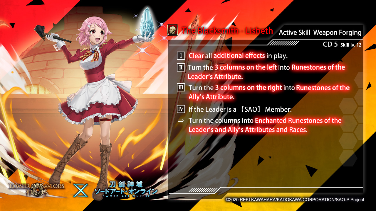 | The Blacksmith – Lisbeth | Own The Black Swordsman – Kirito | By dissolving the Character’s Character Runestone in the first batch, ⇒ the Character launches 2 extra attacks as much as 50% of its Attack. |