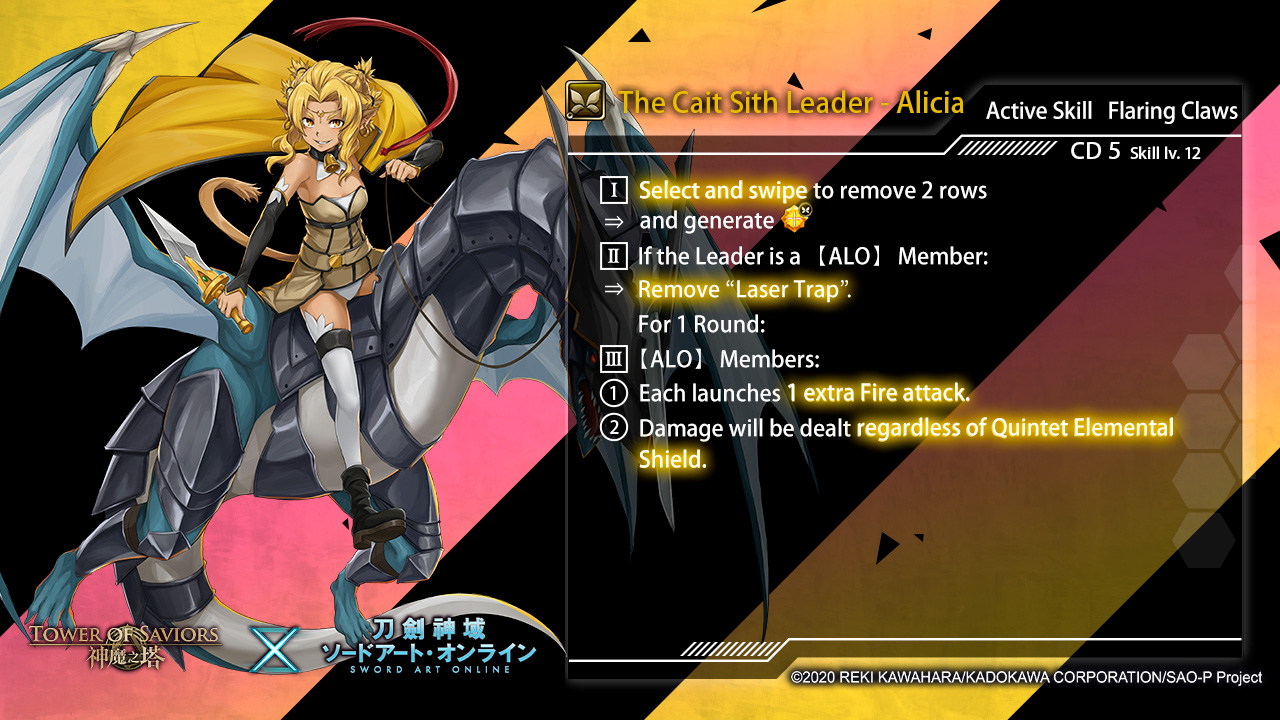 | The Leader is “The Sylph Swordswoman – Leafa” and the Ally is a 【ALO】 Member. | ◆ Extend Runestone-moving time regardlessly by 4 seconds. ◆ All Runestones also possess 50% effect of Earth, Dark and Heart Runestones. ◆ “Sticky” will be nullified. ◆ Damage received from Step Damage will be lowered to 0. ◆ When the current HP is full, ⇒ the Damage received in the Round will not lead to your defeat. ◆ Turn the first 10 Runestones touched while moving into Enchanted Runestones. ◆ After dissolving Runestones, ⇒ the dropping Runestones can be dissolved by aligning 2 or more of them, ⇒ the effect stays in play until 8 Runestones of one type are dissolved in the second batch and onward. ◆ Based on the Attribute(s) and number of Members in the Team, ⇒ “The Sylph Swordswoman – Leafa” and “The Spriggan – Kirito”: Each launches a corresponding number of extra attack(s) of the corresponding Attribute(s) as much as 50% of its own Attack. |