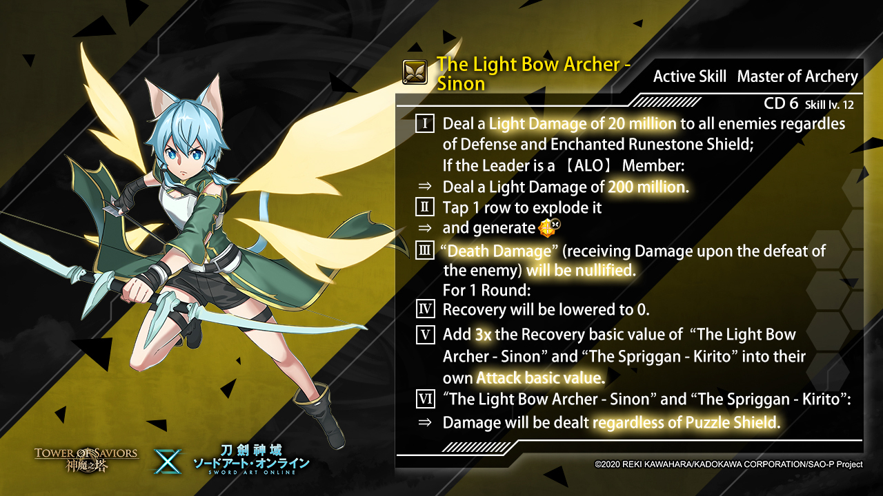 | The Leader is “The Light Bow Archer – Sinon” and the Ally is a 【ALO】 Member. | ◆ Extend Runestone-moving time regardlessly by 4 seconds. ◆ All Runestones also possess 50% effect of Light, Dark and Heart Runestones. ◆ Damage received from “Burning” will be lowered to 1. ◆ Runestone movement will not be stopped and Damage can be dealt when a shot position of Laser Trap is touched. ◆ When the current HP is full,⇒ the Damage received in the Round will not lead to your defeat. ◆ Turn the first 6 Runestones touched while moving into Enchanted Light Elf Runestones. ◆ By dissolving ≥1 group of ≥6 Runestone, For each【ALO】 Member present in the Team: ⓵ “The Light Bow Archer – Sinon” launches 1 extra attack, ⇒ to the max 6 extra attacks. ⓶ Combo count +1 ⇒ to the max +6. ◆ By dissolving a Character Runestone or Elf Runestones, ⇒ Team Attack x 7. ◆ “The Light Bow Archer – Sinon” and “The Spriggan – Kirito”: ⇒ Damage will be dealt regardless of ▋Fixed Combo Shield ▋Trio Elemental Shield, Quintet Elemental Shield. |