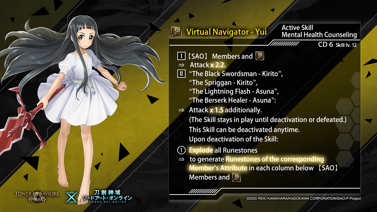 | Virtual Navigator – Yui | Own The Lightning Flash – Asuna | When the Character’s Character Runestone is triggered and no Character Runestone is dissolved in the first batch, ⇒ the Character’s Skill CD -1. |