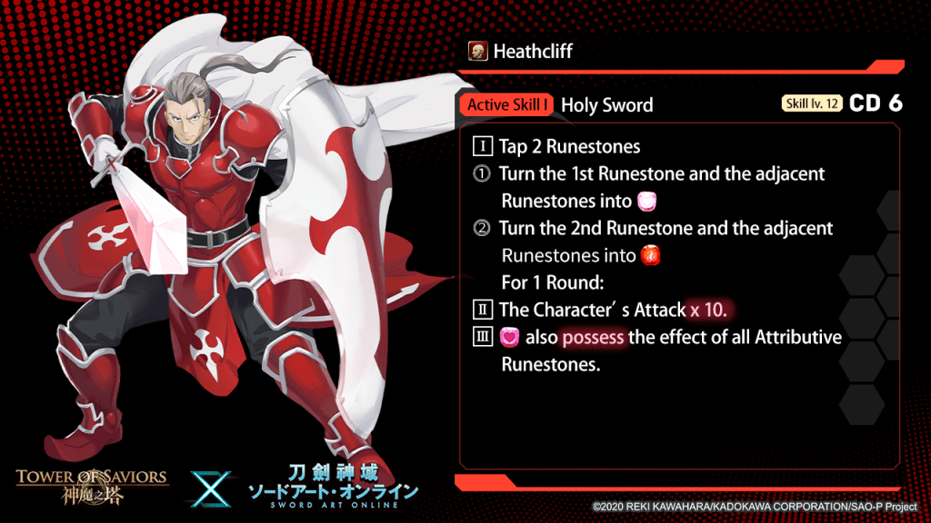 | Heathcliff | Own The Black Swordsman – Kirito | By dissolving the Character’s Character Runestone in the first batch,⇒ the Character launches 5 extra attacks as much as 10% of its Attack. |