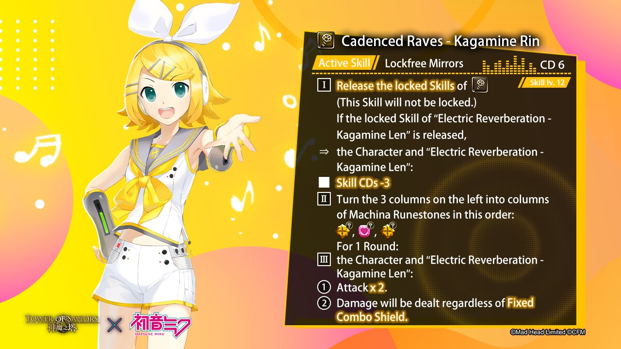 | Cadenced Raves – Kagamine Rin | Own Spikes of Rage – Kagamine Rin & Len | When the Character’s Character Runestone is triggered and no Character Runestone is dissolved in the first batch, ⇒ the Character’s Skill CD -1. |