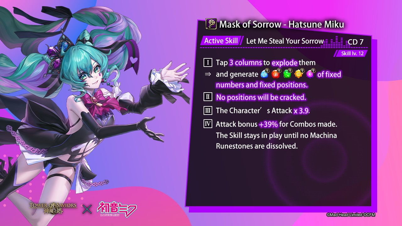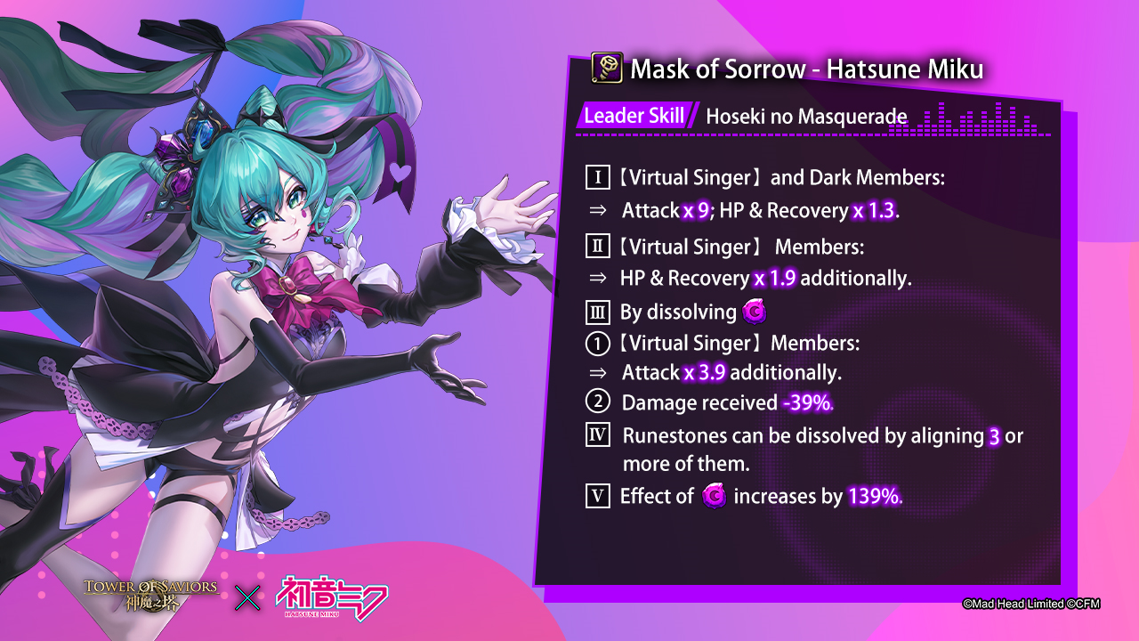 | The Leader is “Mask of Sorrow – Hatsune Miku” and the Ally is a 【Virtual Singer】 Member. | ◆ Extend Runestone-moving time regardlessly by 3 seconds. ◆ “Sticky” will be nullified. ◆ For each Dark Runestone touched while moving,⇒ recover 3,900 HP. ◆ For each Runestone dissolved in the first batch, ⇒ 1 Dark Machina Runestone will be generated in the columns below the Leader and Ally,⇒ to the max 39 Runestones to be generated. ◆ By dissolving Dark Runestones,⇒ Damage will be dealt regardless of Puzzle Shield. ◆ Dark Runestones also possess the effect of Runestones of the 【Virtual Singer】 Members’ Attributes in the Team. ◆ “Mask of Sorrow – Hatsune Miku” in the 【Sorrow】 mode: ⇒ Launches 5 extra attacks (one Attribute each) as much as 39% of its Attack. |