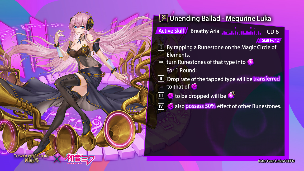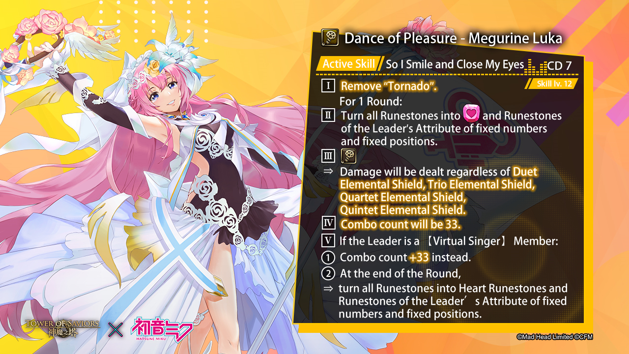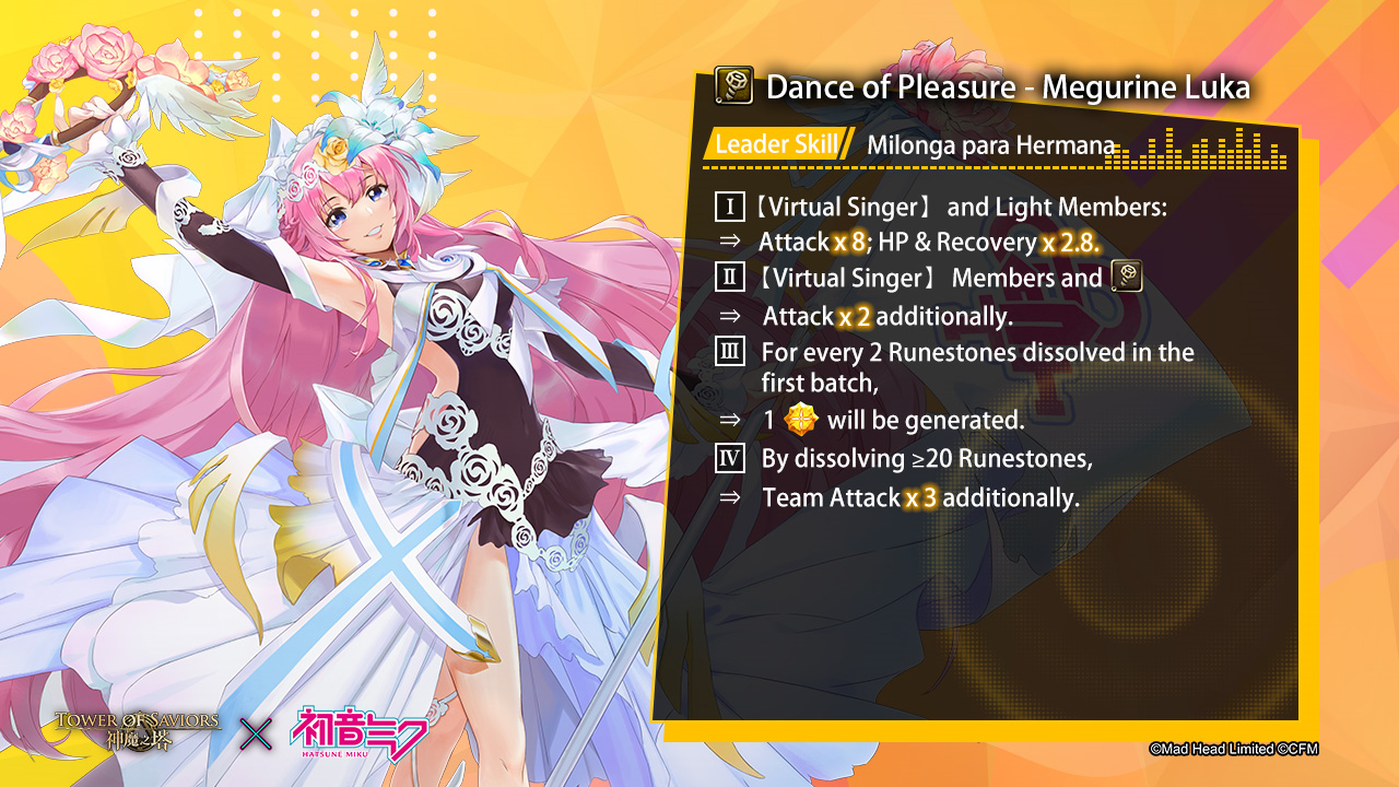 | The Leader is “Dance of Pleasure – Megurine Luka” and the Ally is a 【Virtual Singer】 Member. | ◆ Extend Runestone-moving time regardlessly by 3 seconds. ◆ Runestone movement will not be stopped and Damage can be dealt when a shot position of Laser Trap is touched. ◆ Receive no Damage when touching an “Explosive Bomb”. ◆ Clear the negative state of Electrified Runestones touched while moving, ⇒ and modify them to become Machina Runestones. ◆ Turn the Runestones touched while moving into Enchanted Runestones. ◆ Light Runestones also possess the effect of Runestones of the 【Virtual Singer】Members’ Attributes in the Team. ◆ By dissolving Light Runestones: ⓵ Fully recover HP. ⓶ Machinas: ▋Attack x 6. ▋Damage will be dealt regardless of Fixed Combo Shield. ◆ When “Dance of Pleasure – Megurine Luka” is in the 【Pleasure】 mode: Each time Summoner enters the next Wave, ⇒ electrify all enemies for 1 Round to inactivate them. |