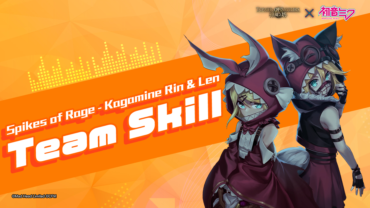 | There is “Spikes of Rage – Kagamine Rin & Len” in the Team. | ◆ “Spikes of Rage – Kagamine Rin & Len” will enter the 【Rage】 mode when one of the following conditions is fulfilled: ▋A burning position is touched. ▋≥30 Fire Runestones are dissolved cumulatively. * 【Rage】 mode will end and the Runestone count will reset upon defeat. ◆ “Spikes of Rage – Kagamine Rin & Len” in the 【Rage】 mode: ⓵ Attack x 1.5. ⓶ Damage dealt to Fire, Earth and Dark enemies x 1.5 additionally. ◆ At the end of each Round: ⇒ Turn the Fire and Heart Runestones in the column below each “Spikes of Rage – Kagamine Rin & Len” in the 【Rage】 mode into Enchanted Fire Runestones. |