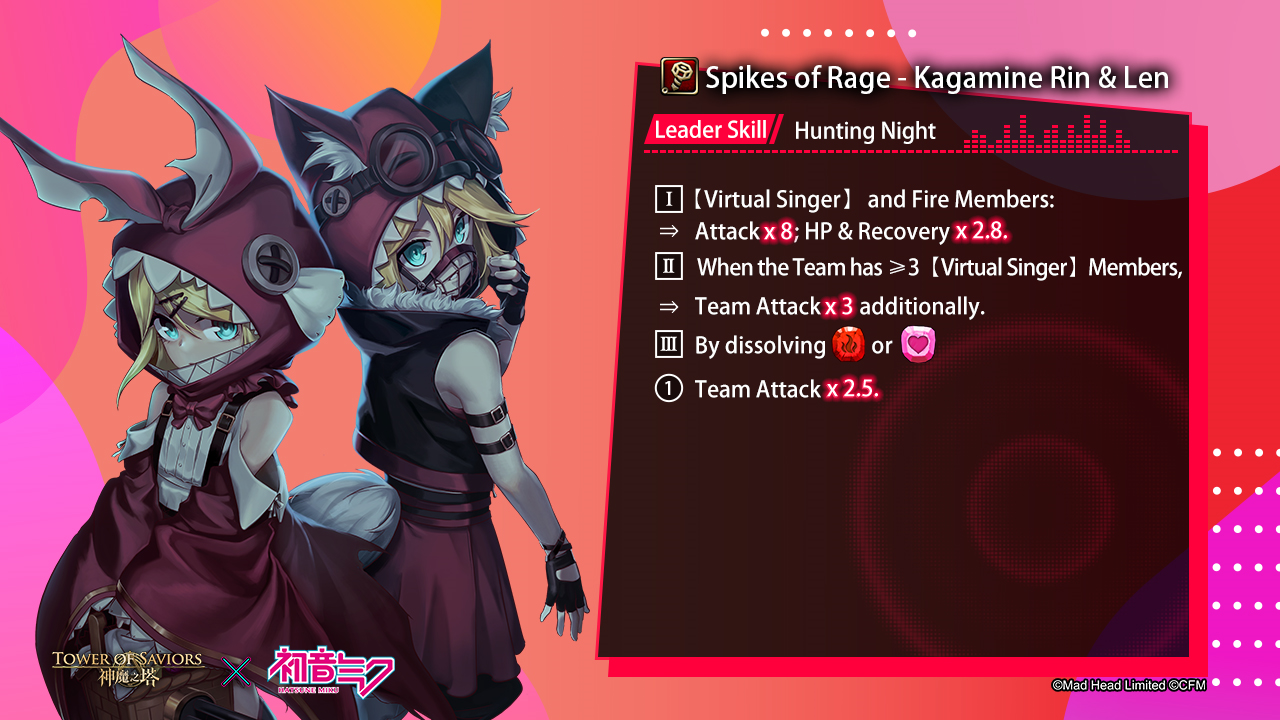 | The Leader is “Spikes of Rage – Kagamine Rin & Len” and the Ally is a 【Virtual Singer】 Member. | ◆ Extend Runestone-moving time regardlessly by 4 seconds. ◆ “Burning” will be nullified. ◆ “Spikes of Rage – Kagamine Rin & Len”: ⓵ Skill CD -4 after entering a Stage. ⓶ Skill CD -1. ◆ Effect of Fire Runestones increases by 200%. ◆ Fire and Heart Runestones also possess the effect of Runestones of the Machinas’ Attributes in the Team. ◆ At the end of each Round, ⇒ explode Runestones of the type used to start the first Runestone movement ⇒ to generate Enchanted Fire Runestones. After successful explosion, ⇒ recover 50% HP ⇒ until Team HP is full. ◆ For each group of ≥4 Runestones dissolved in the first batch, ⇒ Combo count +4, ⇒ to the max +8. ◆ When ≥8 Combos are made,⇒ Machinas: ⓵ Attack x 4. ⓶ Damage will be dealt regardless of Duet Elemental Shield, Trio Elemental Shield, Quartet Elemental Shield and Quintet Elemental Shield. ◆ “Spikes of Rage – Kagamine Rin & Len” in the 【Rage】 mode: ⇒ Attack x 2. |