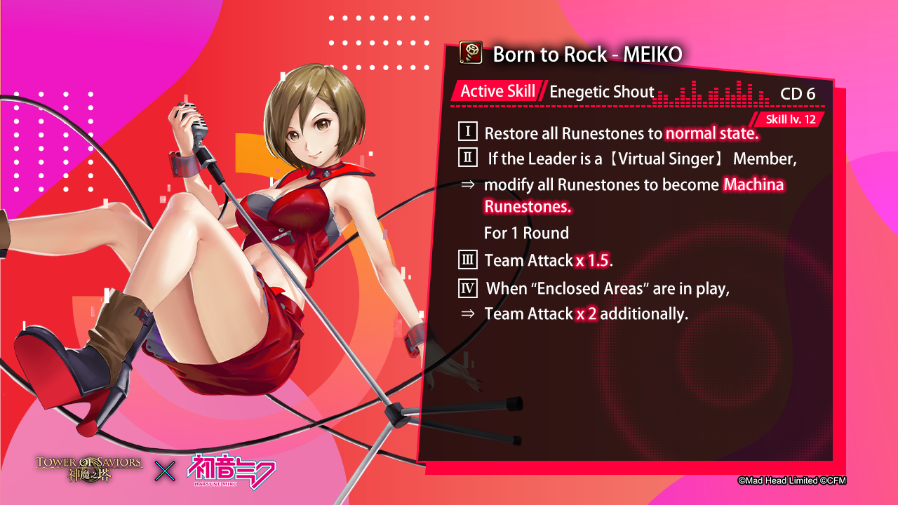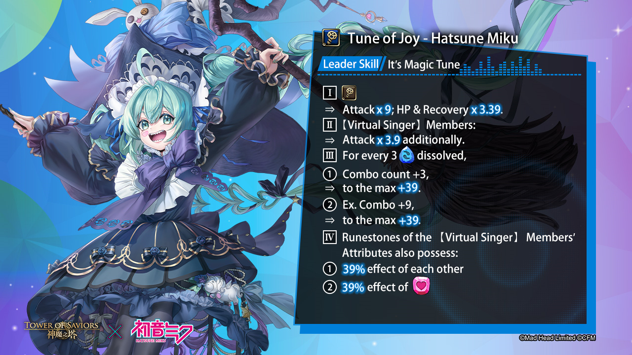 | The Leader is “Tune of Joy – Hatsune Miku”, and the Ally is a 【Virtual Singer】 Member. | ◆ Extend Runestone-moving time regardlessly by 5 seconds. ◆ “Sticky” and “Burning” will be nullified. ◆ When there are Weathered Runestones, Electrified Runestones or Frozen Runestones: ⓵ The Damage received in the Round will not lead to your defeat. ⓶ “Tune of Joy – Hatsune Miku”: ⇒ Attack x 3.9. ◆【Virtual Singer】 Members: ⇒ Damage will be dealt regardless of ⓵ Fixed Combo Shield ⓶ Puzzle Shield ◆ By dissolving ≥3 types of Runestones,⇒ Team Attack x 9. ◆ When ≥39 Combos or Ex. Combos are made in total, ⇒【Virtual Singer】 Members: Skill CDs -1. ◆ When “Tune of Joy – Hatsune Miku” is in the 【Joy】 mode: ⇒ After dissolving Runestones, 5 Enchanted Runestones of the corresponding Member’s Attribute will be generated in each column. |