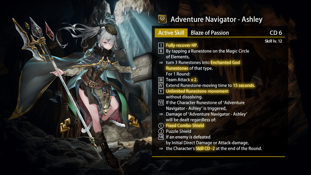 | The Leader is “Adventure Navigator – Ashley”. | ◆ All Runestones also possess the effect of all Runestones. ◆ After dissolving Runestones,⇒ the first 8 Runestones to be dropped will be Runestones of the last type used to end Runestone movement. ◆ Damage received -60%. ◆ When ≥4 Combos are made, ⇒ Team Attack x 6. ◆ When ≥6 Combos are made, ⓵ Each Member launches 1 extra attack. ⓶ “Adventure Navigator – Ashley”:⇒ Skill CD -1. ◆ The more Races are there in the Team,⇒ the more effects will be granted: ▋≥2 Races: ⇒ Turn the Runestones touched while moving into Enchanted Runestones. ▋≥3 Races: ⇒ Damage will be dealt regardless of ⓵ Initial Shield ⓶ Quintet Elemental Shield ▋≥4 Races: ⇒ Combo count +8. |