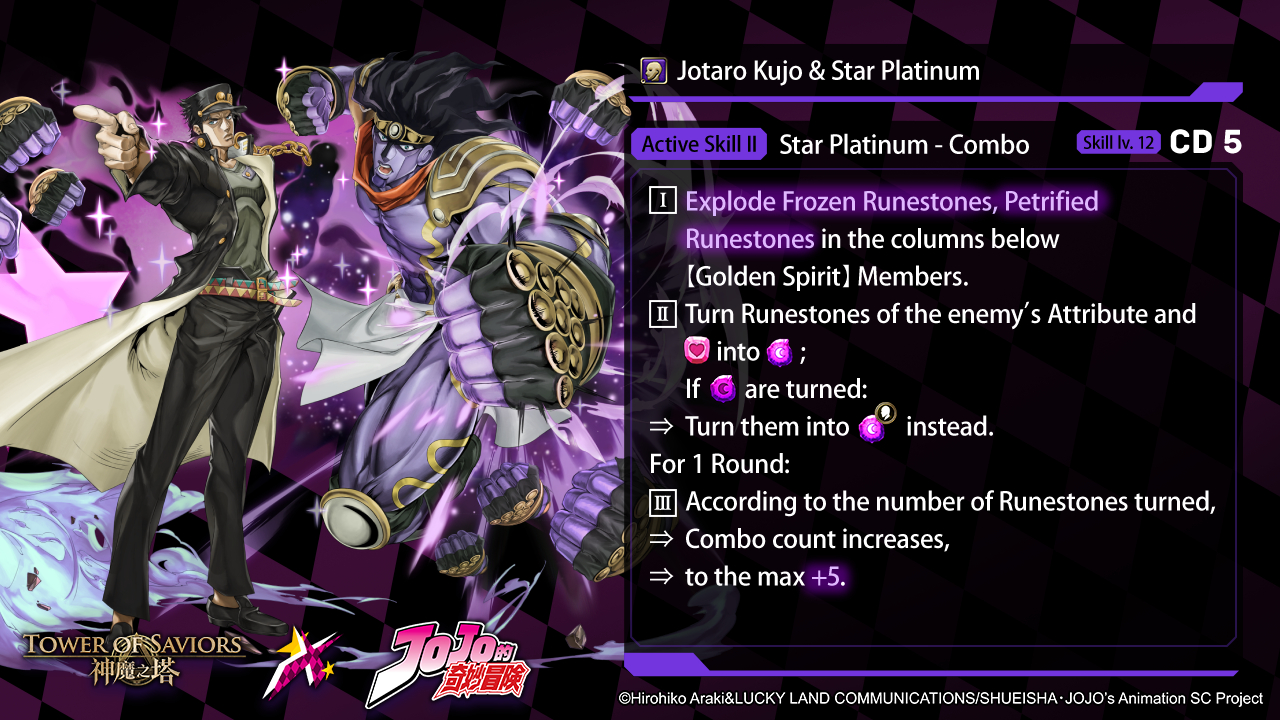 There is “Jotaro Kujo & Star Platinum” in the Team. | ◆ “Jotaro Kujo & Star Platinum”: ⓵ Acquire 【Stand】 mode. ⓶ “Jotaro Kujo & Star Platinum” in the 【Stand】 mode: ▋ Attack & Recovery x 1.5. ▋Change its Active Skill I to 【Star Platinum – Barrage of Strikes】 (CD 8;Skill Lv. 12) For 3 Rounds: I. Extend Runestone-moving time by 2 seconds. II. The Character’s Damage will be dealt regardless of: ⓵ Initial Shield ⓶ Boss Skill〖Corruption〗 III. Non-【Golden Spirit】Members launch no attack. IV. The Character launches 30 extra Dark attacks as much as 30% of its Attack. ▋Change its Active Skill II to 【Star Finger】 (CD 5;Skill Lv. 12) I. Explode Frozen Runestones, Petrified Runestones and Condensed Runestones in the columns below 【Golden Spirit】 Members. II. Deal a Dark Damage of 300 million to all enemies regardless of Defense and Enchanted Runestone Shield. III. Turn Heart Runestones and Runestones of the enemy’s Attribute into Enchanted Dark Human Runestones. For 1 Round: IV. According to the number of Runestones turned, ⇒ Combo count increases, ⇒ to the max +8. * 【Stand】mode will end upon defeat. |