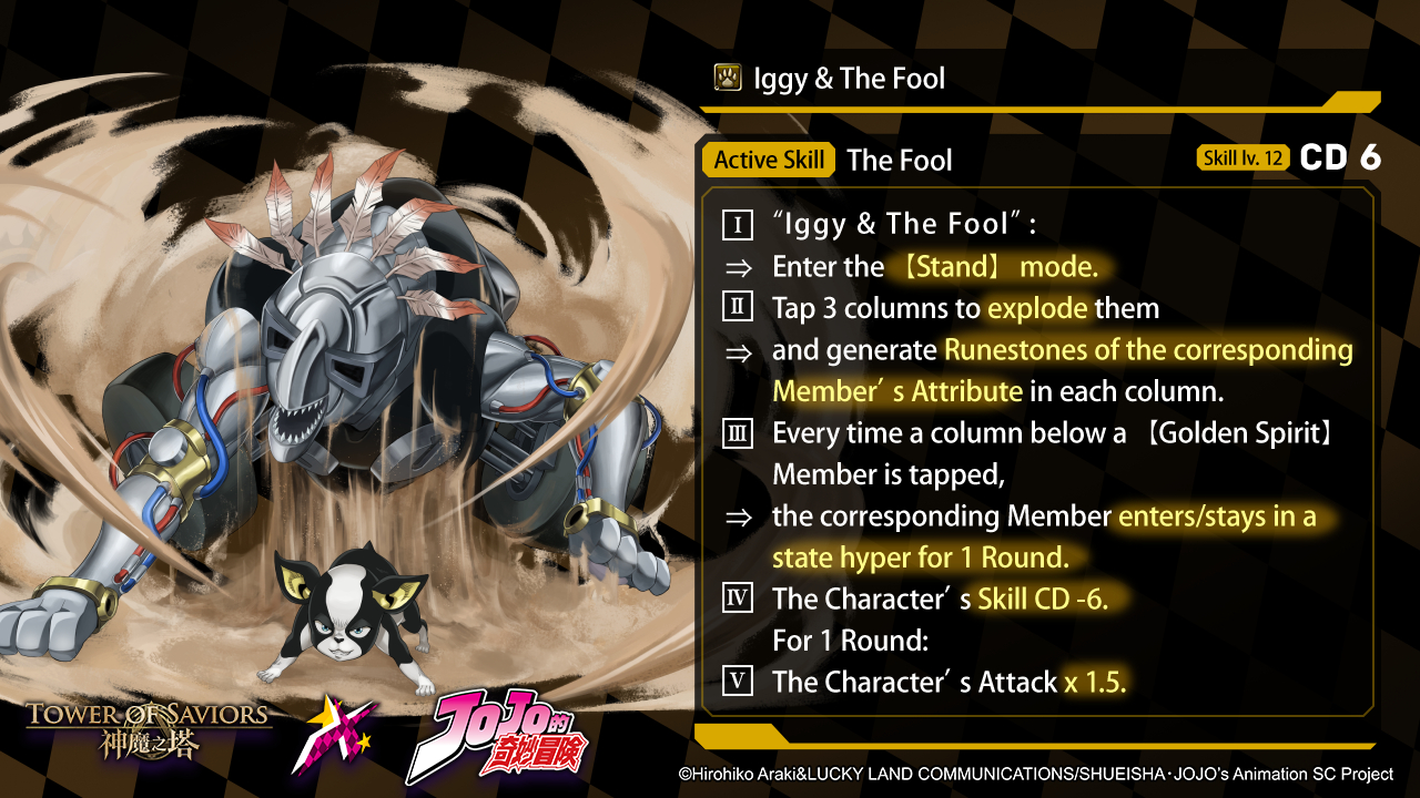 | There is “Iggy & The Fool” in the Team. | ◆ “Iggy & The Fool”: ⓵ Acquires 【Stand】 mode. ⓶ “Iggy & The Fool” in the 【Stand】 mode: ▋ Attack & Recovery x 1.5. ▋Change its Active Skill to 【A Proud Soul】 (CD 6; Skill Lv. 12) I. Tap 3 columns to explode them ⇒ and generate Enchanted Runestones of the corresponding Member’s Attribute and Race in each column. II. Every time a column below a 【Golden Spirit】 Member is tapped, ⇒ the corresponding Member enters/stays in a hyper state for 1 Round. For 1 Round: III.【Golden Spirit】and Light Members:⇒ Damage will be dealt regardless of Fixed Combo Shield; If the Leader is a 【Golden Spirit】 Member:⇒ Effect IV stays in play for 2 Rounds instead. * 【Stand】mode will end upon defeat. |