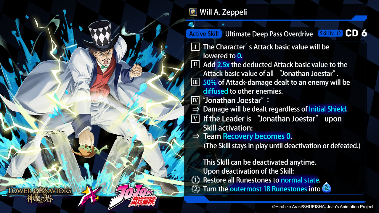 | Caesar Anthonio Zeppeli | Own Joseph Joestar | By dissolving the Character’s Character Runestone in the first batch, ⇒ the Character launches 2 extra attacks as much as 50% of its Attack. |