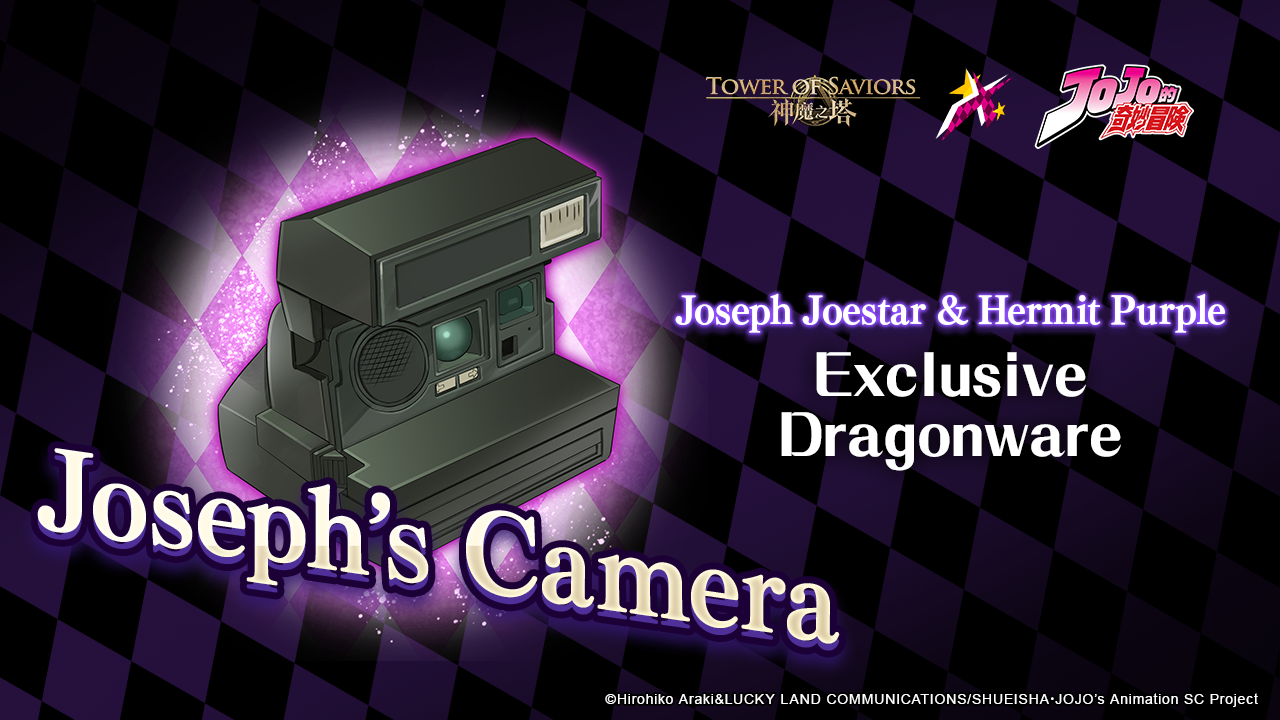 “Joseph Joestar & Hermit Purple”, who showcases a seasoned fighting style by combining the Hamon techniques he learned in the past, will bring Summoners a new Challenge Stage called “Wisdom of the Aged Strategist” on 15 Jan (Mon). There will be a stage entrance restriction: only 【JoJo’s Bizarre Adventure】 Members are allowed in the Team. Summoners can get “Joseph Joestar & Hermit Purple” x1 upon each clearance of the “Wisdom of the Aged Strategist Lv.1” floor and the character-exclusive Dragonware “Joseph’s Camera” (random mode) x1 upon each clearance of the “Wisdom of the Aged Strategist Lv.2” floor.