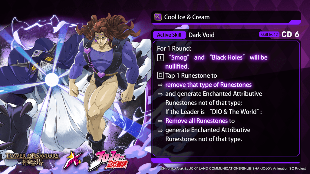 | DIO & The World | Own Dual Max Cool Ice & Cream | By dissolving the Character’s Character Runestone in the first batch, ⇒ the Character’s Damage dealt to Human enemies +100%. |